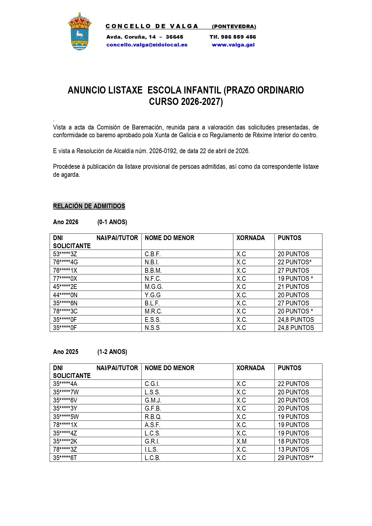 Trala valoración das solicitudes realizada pola Comisión de Valoración, apróbase a relación provisional de admitidos na Escola Infantil Municipal para o curso 2026-2027.